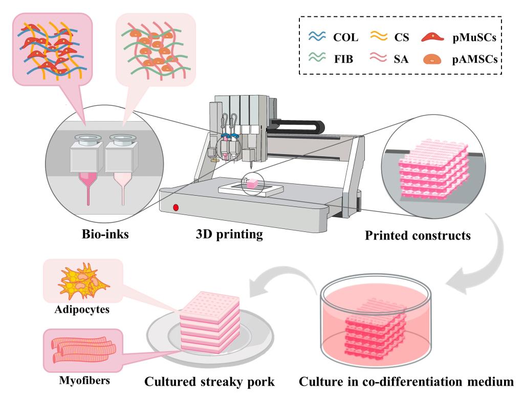 细胞培养肉技术通过体外培养动物细胞而非传统动物养殖进行肉制品生产。在二维培养条件下,肌肉和脂肪源干/祖细胞的体外增殖分化机理以及调控方法已经得到了广泛的研究。然而,如何构建最佳的三维培养体系,以制备出与真实动物肉具有相似组分、质构和纹理的细胞培养肉,仍有待进一步探究。3D生物打印技术因其灵活性、个性化定制以及组织结构仿生方面的显著优势,被认为是制造块状细胞培养肉的一种可行策略。目前,尽管已有采用3D生物打印技术成功制备肌肉或脂肪组织的报道,但如何进行多种细胞的共打印和共培养以实现整合肌肉和脂肪组织的细胞培养五花肉的工程化生产,仍然是当前研究面临的一项挑战。