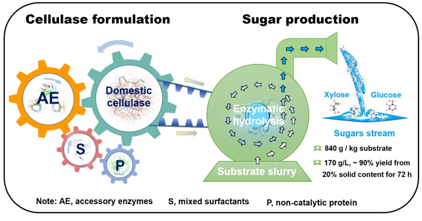高效制备第二代可发酵糖是实现酶基木质纤维素生物精炼的关键。然而,目前普遍酶用量高导致酶水解制糖过程成本高昂,比如纤维素乙醇生产时酶水解成本占总成本的25−30%,这严重阻碍了由纤维质原料生产大宗发酵品(生物基化学品/燃料)的绿色生物制造进程。因此,研究开发高效生产可发酵性糖的高固低酶水解糖化工艺,对于生物基化学品/燃料的绿色生物制造工业化至关重要。已有文献表明,表面活性剂和非催化蛋白等添加剂能通过增强酶活性、减少木质素吸附、促进酶与底物作用等从而显著提升酶水解效率。然而,表面活性剂是否能联合使用以及价格低廉的植物蛋白是否能用于纤维质底物的高固糖化过程,尚不清楚。结合当前国际商业化纤维素酶制剂成本过于昂贵,该论文旨在研究国产纤维素酶的适配性,针对甘油有机溶剂预处理甘蔗渣,筛选各种表面活性剂和植物蛋白并与纤维素酶复配定制,最终实现底物的浓醪低酶水解工艺。国产纤维素酶制剂LT4在2 mg/g纤维素酶载量条件下通过分批补料方式达到20%(w/v)固体含量,酶解72 h的可发酵糖滴度到达170 g/L(~90%产量),达到大宗发酵初始碳源用量水平。经济成本初步分析表明,可发酵糖生产成本为2 USD/kg,达到国际上报道的纤维质糖生产工艺成本的普通水平(0.1−3.37 USD/kg),影响成本的关键在于木糖苷酶和葡萄糖苷酶等辅助酶过于昂贵。假设在纤维素酶生产菌株中表达这些辅助酶,那么这些辅助酶的生产成本可以降低到国产纤维素酶制剂的销售水平(2.8 USD/kg),可发酵糖的生产成本有望降低到0.56 USD/kg,接近目前淀粉糖的生产成本(0.22−0.55 USD/kg)。总之,该论文为研究开发具有工业化价值的纤维质原料酶法水解制糖工艺提供了技术借鉴。