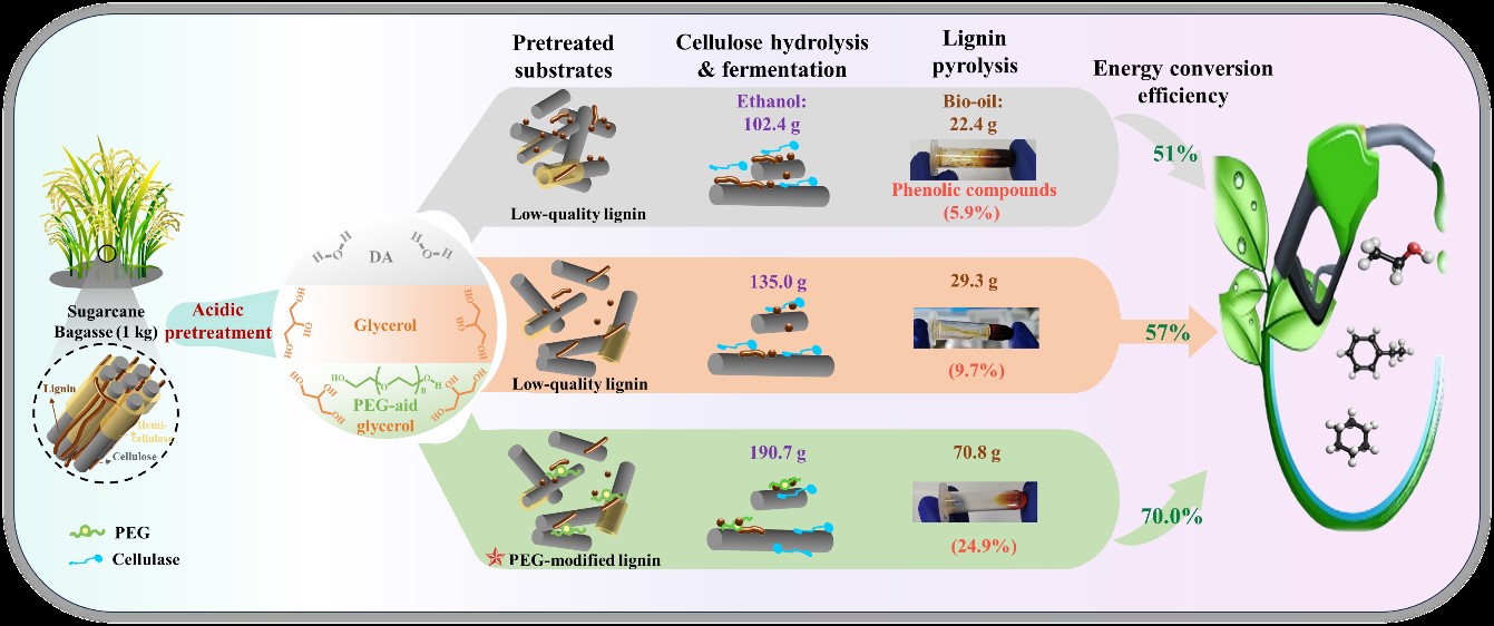 酶基生物质炼制工艺主要包含预处理、酶解和发酵等工段。其中,预处理作为打破生物质复杂且致密结构、增强后续酶解和发酵效率的关键步骤,决定了整个生物炼制过程效率。如何通过预处理技术最大限度提高木质纤维素的酶解性,并有效利用剩余木质素,是推进生物质精炼产业化的核心问题。孙付保教授研究团队此前开发的甘油有机溶剂预处理方法取得良好效果,但与其它大多数预处理技术一样,在预处理过程中仍存在严重的木质素再缩合副反应现象。这不仅加剧了木质素对纤维素酶的非生产性吸附从而大幅削弱了酶解和发酵效率,还限制了木质素的增值利用。