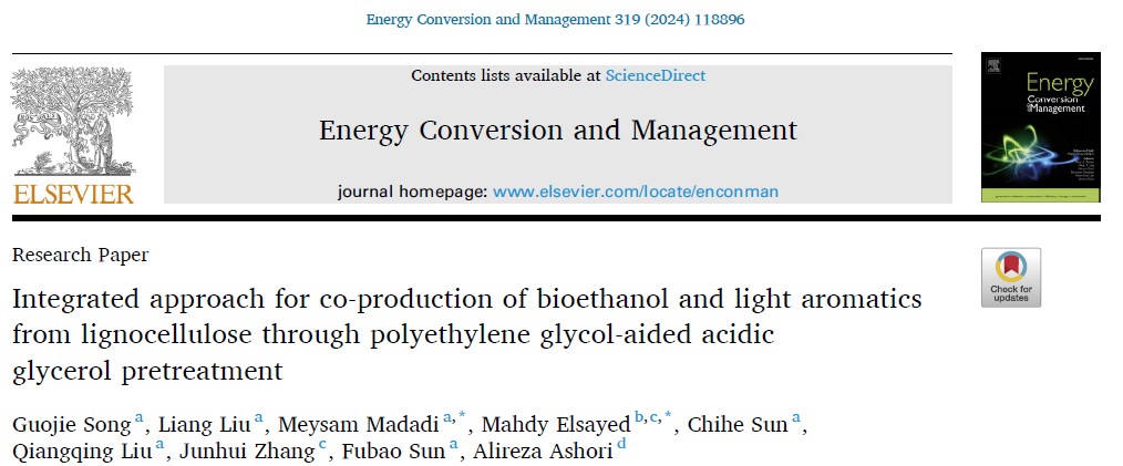 近期,我校伟德国际1946官方网生物资源与生物炼制研究团队在木质纤维素生物质联产生物乙醇和轻质芳烃化合物方面取得重要进展,研究成果“Integrated approach for co-production of bioethanol and light aromatics from lignocellulose through polyethylene glycol-aided acidic glycerol pretreatment”正式发表于Energy Conversion and Management(一区, Top, IF 9.9)。