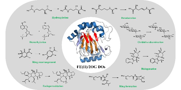 徐岩教授团队聂尧教授课题组在Natural Product Reports发表综述文章:天然产物合成中的Fe(II)和2-酮戊二酸依赖型双加氧酶:反应多样性的分子见解(2021级博士研究生赵松垠为一作)