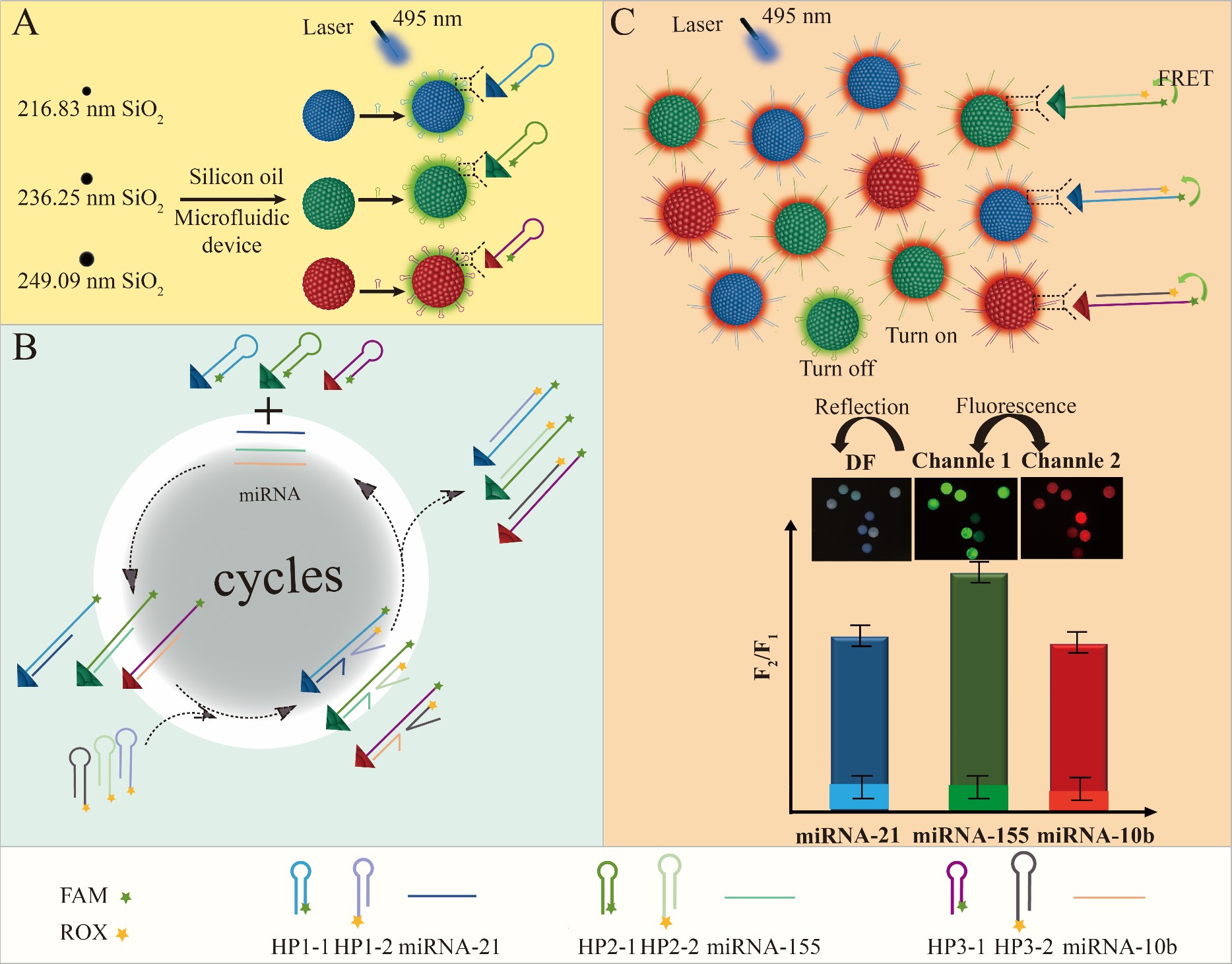 miRNA是一类短小的非编码单链RNA,在调节基因表达、细胞分化和细胞增殖等生物过程中扮演着重要角色。此外,miRNA也被认为是早期肿瘤诊断的理想生物标志物。通过同时检测多种miRNA,有助于深入了解miRNA的功能,从而实现对乳腺癌的可靠、准确的临床诊断具有重要意义。最近研究表明悬浮阵列作为一种有前途的编码方法,具有快速检测、高灵敏度和低成本等优点,然而,传统的信号响应方法,如荧光染料容易猝灭或褪色,而量子点往往存在生物毒性等限制,因此,设计miRNA的多靶标检测方案仍然面临挑战。