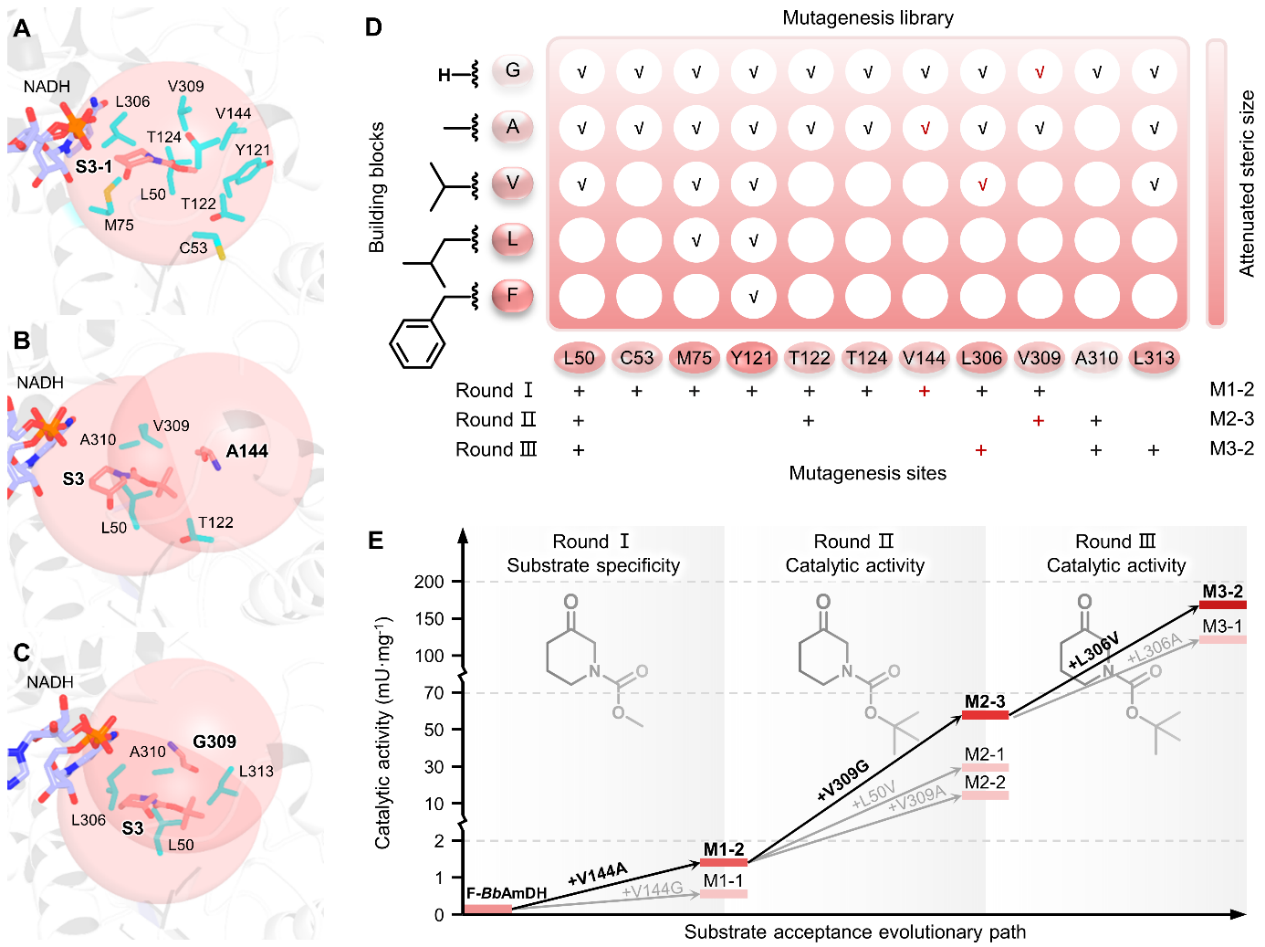 在此背景下,研究人员基于其以往在胺脱氢酶底物识别机制解析及底物接受度改造策略开发方面的工作(ACS Catalysis. 2023; 13: 158-168(见往期推荐:伟德国际1946源于英国穆晓清/聂尧组ACS Catalysis|重塑亮氨酸脱氢酶底物结合口袋以双向催化结构多样性底物)、ACS Catalysis. 2024; 14: 2685-2695-封面论文、Chemical Engineering Journal. 2024; 490: 141735),选择N-Boc-3-哌啶酮作为本研究中胺脱氢酶催化的氮杂环酮模型底物,通过基于逆行底物设计策略的起始底物筛选,对模型底物进行结构拆解,选择小尺寸的N-Boc-3-乙酸甲酯作为底物接受度改造的起始底物,并以起始底物的催化活性为筛选指标,从实验室建立的小型胺脱氢酶文库中筛选出源于栗褐芽孢杆菌(Bacillus badius)的苯丙氨酸胺脱氢酶(F-BbAmDH)作为目标氮杂环酮底物接受度改造的出发酶。随后,进一步通过基于结构指导的底物结合口袋空间位阻突变对F-BbAmDH进行底物接受度进化,获得的单点突变体V144A成功产生了模型底物N-Boc-3-哌啶酮的底物特异性,额外的两轮迭代位点组合突变构建的三点突变体V144A/V309G/L306V对模型底物N-Boc-3-哌啶酮的催化活性较单点突变体V144A提高了143.4倍(图2)。