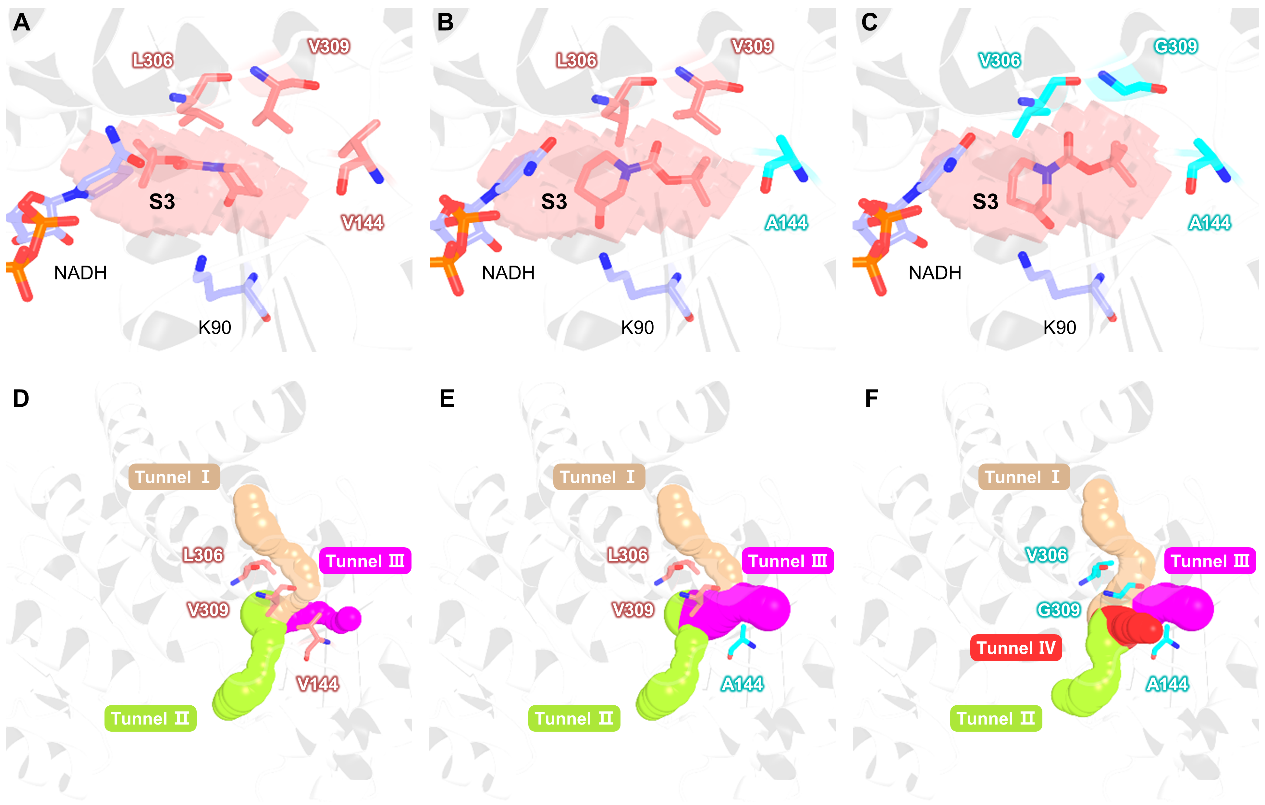 制备规模合成表明突变体V144A/V309G/L306V具有显著扩展的目标氮杂环酮底物范围,可催化一系列结构多样的N-Boc取代的氮杂环酮的不对称还原胺化,从而制备相应的高附加值手性氮杂环胺,且突变体维持了优异的立体选择性,所有产物ee值均>99%(图3)。基于酶-底物复合物结构特征的计算分析为突变体催化氮杂环酮底物特异性的来源和催化活性的改善提供了详细的分子见解(图4)。
