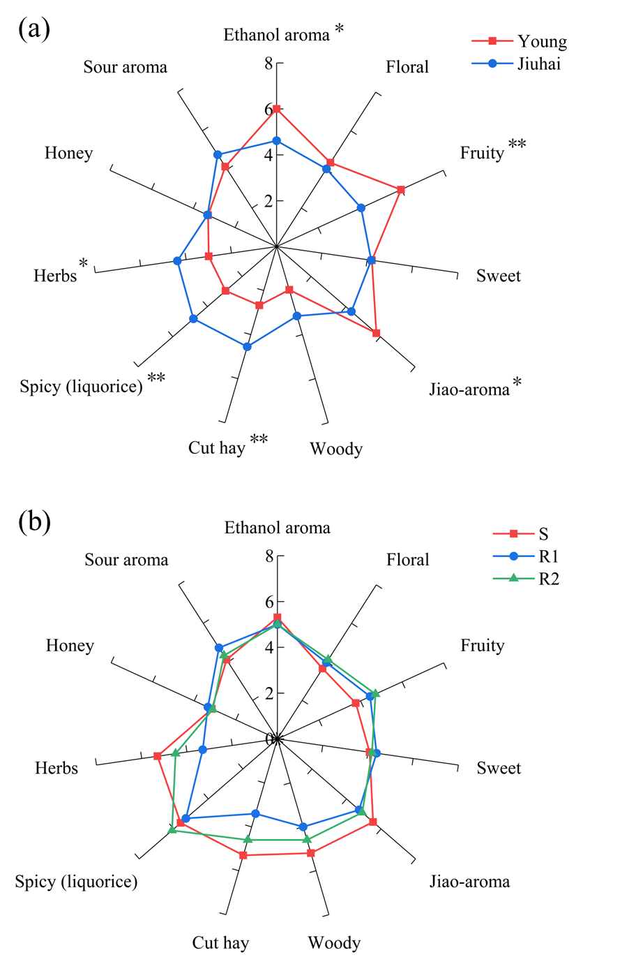 本研究采用适合项勾选法(check-all-that-apply,CATA)和定量描述分析法(quantitative descriptive analysis,QDA)对酒海味的香气特征进行系统表征,发现酒海味是一种复合香气,融合了草药、香料、干草和木质属性的协调香气;使用分子感官科学的方法对酒海贮酒样品的重要香气物质进行了解析,发现酒海贮酒的香气化合物种类(71种)多于新酒(54种),以萜类和芳香族化合物为主;定量结果表明酒海贮酒中的萜类、吡嗪、内酯和酚类的含量高于新酒;通过香气重组和缺失实验证了酒海老熟风味关联的关键香气物质。同时研究发现处于亚阈值浓度的7种萜类也可以通过相互作用对酒海味产生重要影响;使用Feller模型发现这7种亚阈值萜类之间大多具有协同和加成作用,进一步证实了亚阈值化合物之间的相互作用可以促进香气感知。本研究在国际上首次系统解析了中国传统木酒海贮酒形成的独特风味的化学本质,丰富了白酒酒海贮存老熟风味化学机理的认识。
