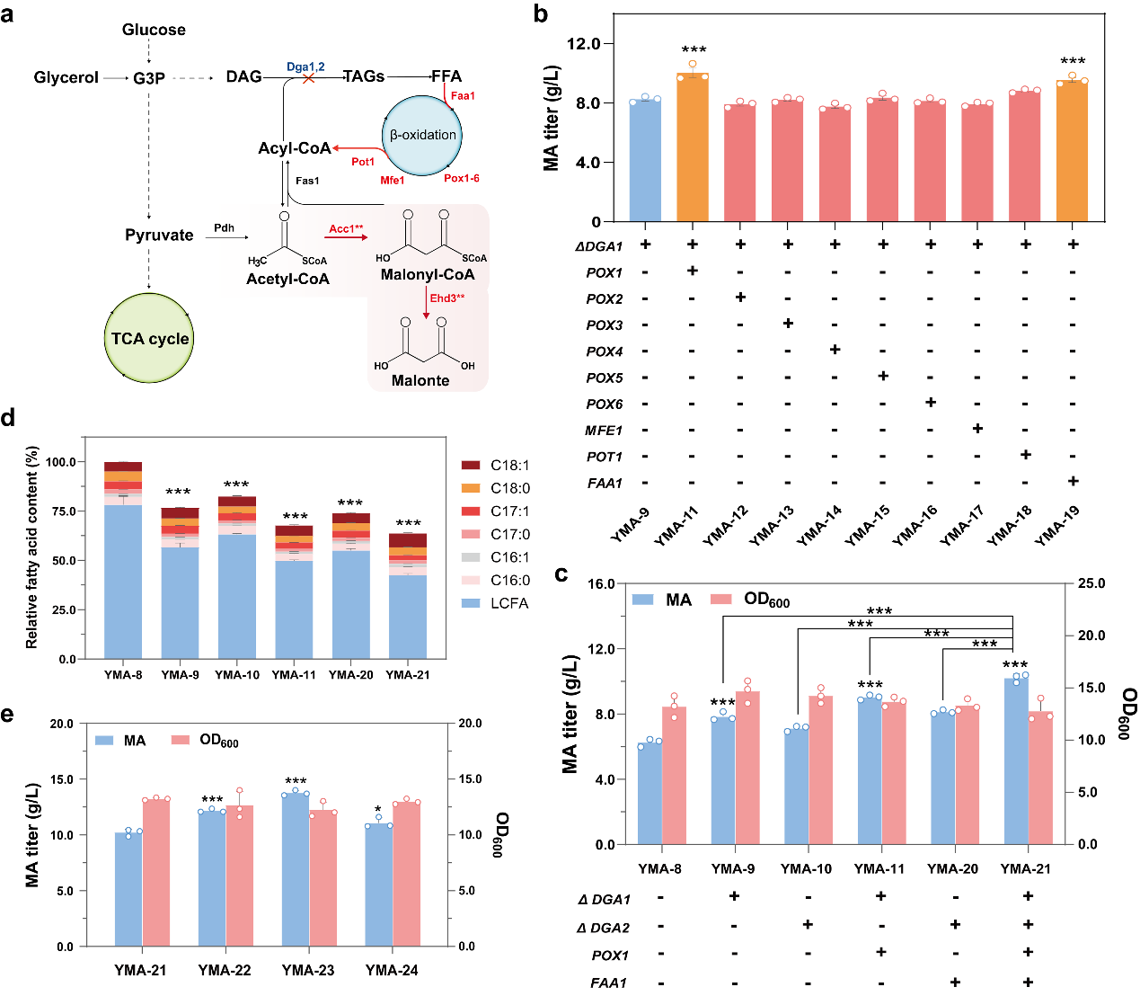 近期,我校伟德国际1946官方网邓禹教授课题组在代谢工程改造解脂耶氏酵母高效合成丙二酸方面取得重要进展,研究成果“Engineering Yarrowia lipolytica to Enhance the Production of Malonic Acid via Malonyl-CoA Pathway at High Titer” 正式发表于Advanced Science (IF =/info/1021/ /14.3)(https://doi.org/10.1002/advs.202411665)。