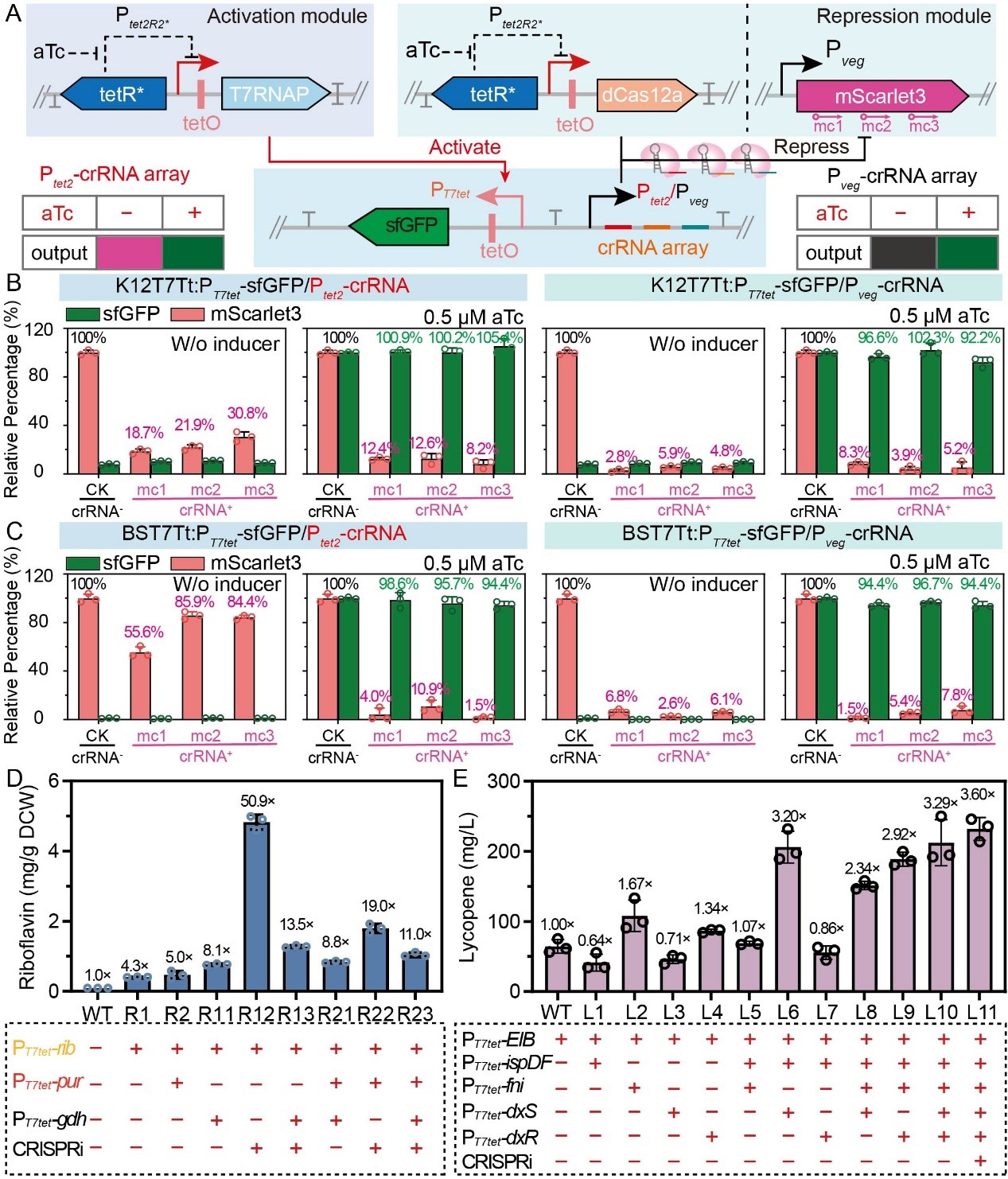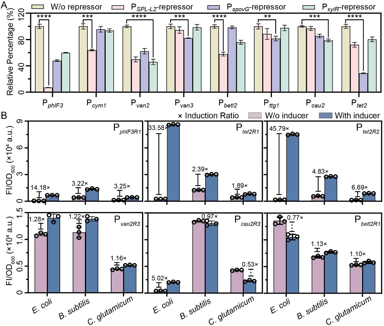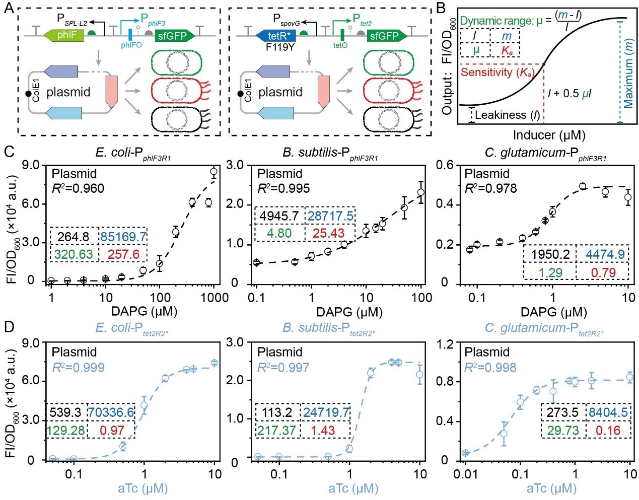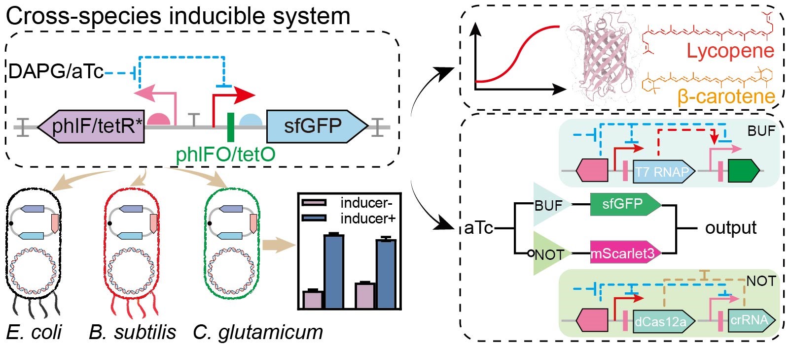 为了解决这一难题,研究人员通过设计并构建了跨菌株诱导表达系统,旨在增强细菌中的蛋白质表达并实现多重代谢途径精细调控(图1)。首先,研究人员详细设计了跨菌株诱导表达系统的构建流程(图2),并将该方法应用于三种常见的模式微生物(大肠杆菌、枯草芽孢杆菌和谷氨酸棒状杆菌),筛选出可在三种菌株中实现诱导表达的2,4-二乙酰基间苯三酚(DAPG)和脱水四环素(aTc)诱导表达系统(图3)。为进一步优化表达系统的性能(包括低泄漏,高最大表达强度,高灵敏度和宽动态范围),研究人员构建了阻遏蛋白随机突变文库,并通过筛选获得了在三种菌株中表现优异的突变体(图4)。随后,研究人员对DAPG-和aTc诱导表达系统在三种菌株中的表达曲线进行详细表征,确定了最佳诱导时间与诱导浓度,以便于后续应用。接着,性能更优益的aTc诱导表达系统被用于调控三种菌株中蛋白质表达(sfGFP,mcherry和mScarlet3)以及紫色杆菌素等代谢产物的调控表达(图6)。最后,研究人员利用aTc诱导系统构建了可用于基因激活与抑制的单输入基因回路,对该基因回路进行表征和应用(图7)。