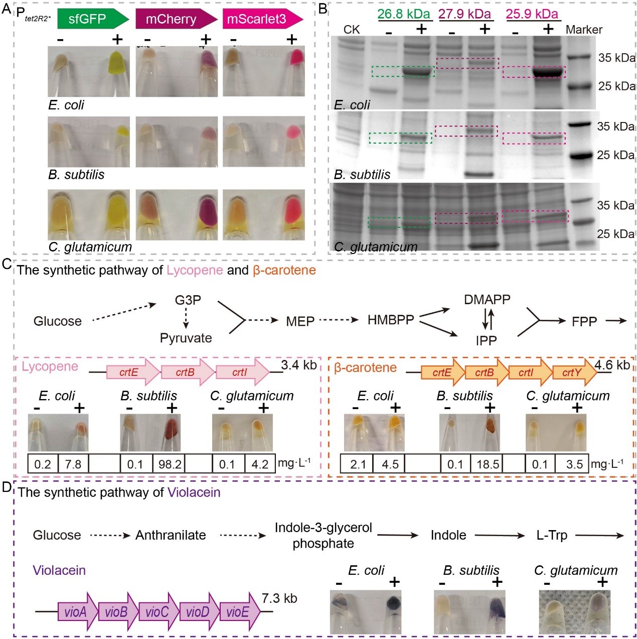 图6 aTc诱导系统在大肠杆菌、枯草芽孢杆菌和谷氨酸棒状杆菌中蛋白表达和生物合成基因簇调控中的应用