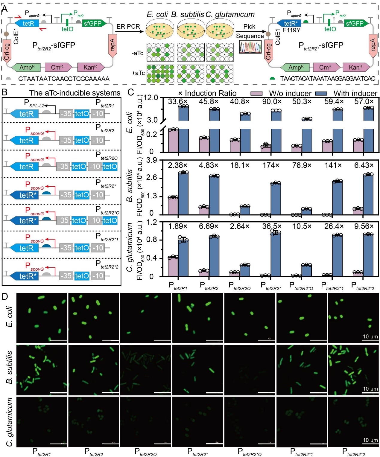 图4 aTc诱导表达系统在大肠杆菌、枯草芽孢杆菌和谷氨酸芽孢杆菌的表征与改造