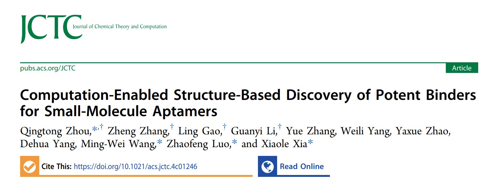 近期,伟德国际1946官方网夏小乐教授团队联合复旦大学周庆同教授在核酸适配体的开发和利用研究中取得重要进展,研究结果“Computation-Enabled Structure-Based Discovery of Potent Binders for Small-Molecule Aptamers”正式发表于计算化学领域顶刊《Journal of Chemical Theory and Computation》(一区,IF=5.7)(https://doi.org/10.1021/acs.jctc.4c01246)。
