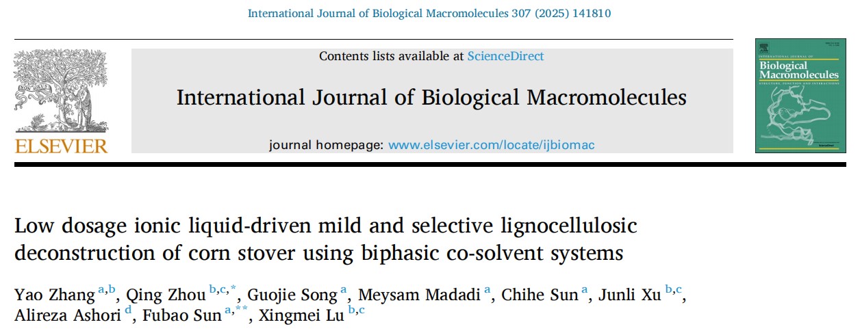 近期,我校伟德国际1946官方网生物资源与生物炼制研究团队在质子型离子液体高效拆解木质纤维素生物质方面取得重要进展,研究成果“Low dosage ionic liquid-driven mild and selective lignocellulosic deconstruction of corn stover using biphasic co-solvent systems”正式发表于International Journal of Biological Macromolecules(一区, Top, IF 7.7)。