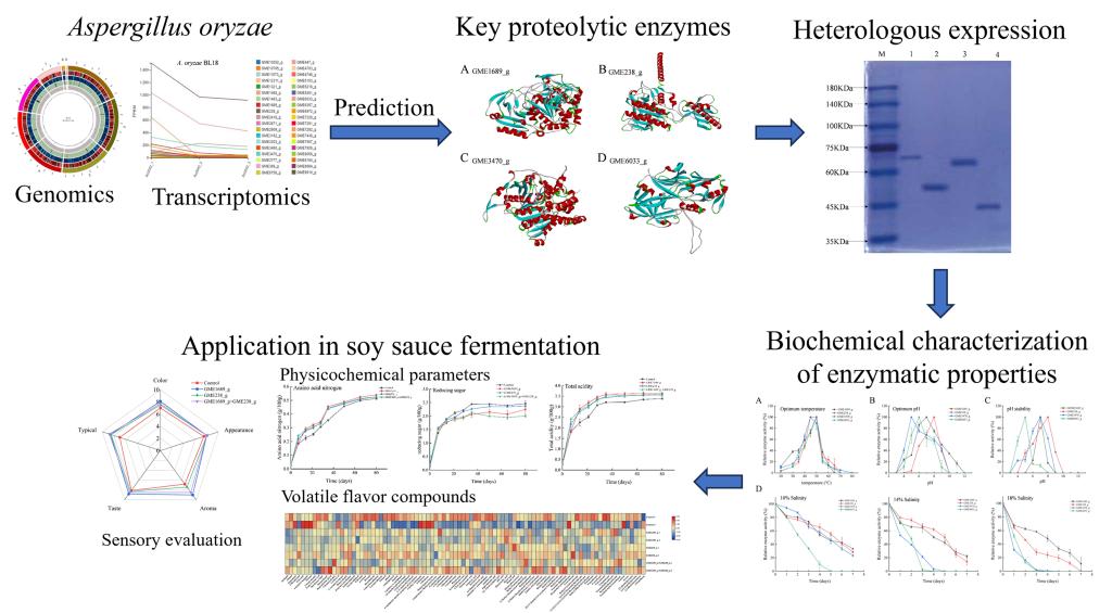 李崎教授团队通过基因组和转录组分析挖掘米曲霉BL18中的关键蛋白酶,表征了其生化特性,并评估了其在酱油发酵中的应用效果,以提升对米曲霉蛋白酶系统的理解并优化酱油品质。通过全基因组测序,在米曲霉BL18中注释到142个蛋白酶基因。经SignalP4.0和TMHMM软件筛选,预测出38个具有分泌能力的蛋白酶基因(含25个肽酶和13个蛋白酶)。结合转录组分析,发现GME1689_g(三肽基肽酶 I)、GME238_g(碱性蛋白酶 2)、GME3470_g(羧肽酶Y)和GME6033_g(液泡蛋白酶A)在制曲过程中表达量较高,预测其为米曲霉制曲过程关键蛋白酶。为探究其酶学性质,将4个蛋白酶基因在毕赤酵母GS115中实现了异源表达,发现GME1689_g和GME238_g为中性酶(最适pH7-8),而GME3470_g和GME6033_g为酸性酶(最适pH5-6)。四个蛋白酶的最适温度均为45-50℃,且有一定的耐盐性。以蚕豆中清蛋白(水溶蛋白)和球蛋白(盐溶蛋白)为底物测定他们的水解度,发现GME1689_g和GME238_g对球蛋白和清蛋白的降解度更高(120 min时达28%-35%),且复合使用时降解度显著提升(球蛋白56.31%;清蛋白49.91%)。最后,在酱油发酵初期添加GME1689_g和GME238_g(单独或复合),发现酱醪中的游离氨基酸和氨基氮含量显著提高,挥发性风味化合物(如芳樟醇、1-辛烯-3-醇)的数量和浓度显著增加。添加蛋白酶所得酱油色泽更亮、酱香更浓,感官评分(8.0-8.5分)显著高于对照组(7.5分)。论文鉴定了米曲霉BL18制曲关键蛋白酶,并明确了其酶学性质及应用效果,为米曲霉蛋白酶的研究和酱油品质改良提供了理论依据和技术支持。