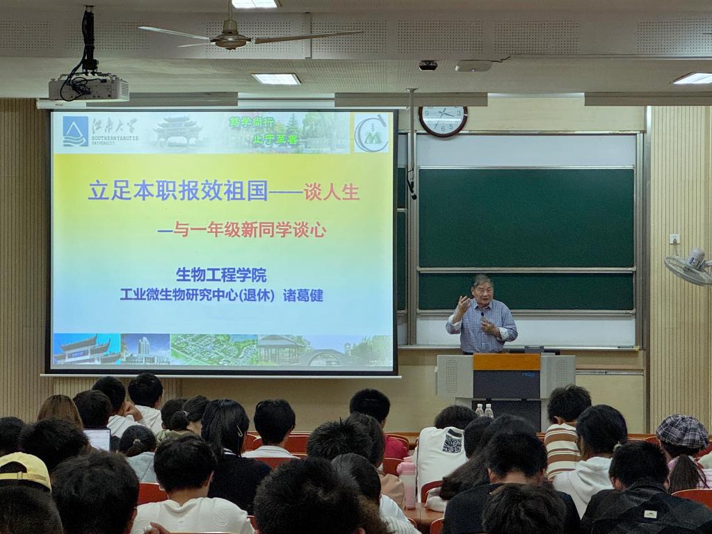 随后,诸葛健教授讲述了他科学研究、创新产业等的经历,他重于科研,勤于总结,重点强调了学生创新意识的培养,真正践行了“善于实践,勇于创新”的发酵精神。最后,诸葛健教授表达了对同学们殷切的希望:“要虚心好学,培养自己能做能写能说的能力,德智体全面发展。”