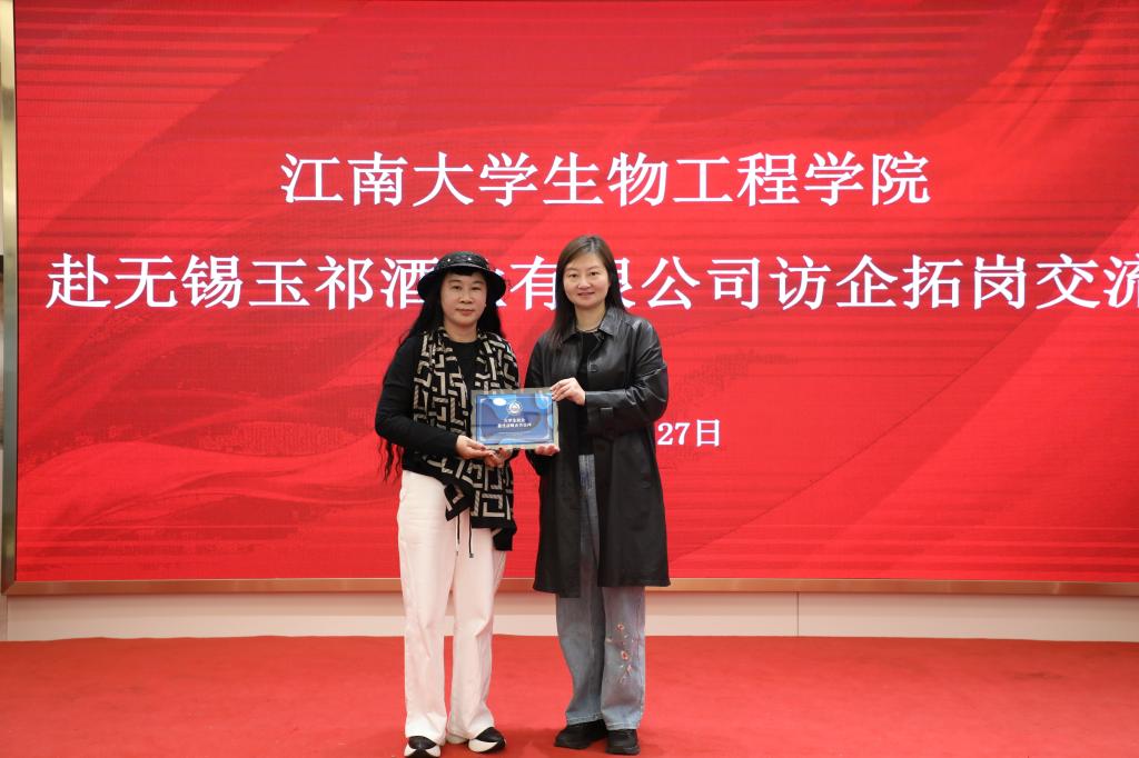 座谈交流环节,无锡玉祁酒业有限公司董事长顾春燕对来访师生表示欢迎。她还介绍了公司的发展情况、人才政策、营销理念,期待校企双方能进一步深化合作,为酿酒行业的人才培养和产业发展作出贡献。林丹表示,玉祁酒业是一家知名的“中华老字号”品牌,也是伟德国际1946官方网理事单位,校企双方渊源深厚。本次访企拓岗交流活动,旨在推进求职学生与玉祁酒业的“双向奔赴”。公司包装车间主任张捍东、生产经理高翔、质量部长刘翠,仓库主任沈伟燕一同参加了座谈,并与同学们关心的玉祁酒工艺特点、行业发展情况、公司员工发展路径等进行了深入交流。会后,林丹还向顾春燕授牌“大学生就业最佳战略合作伙伴”。