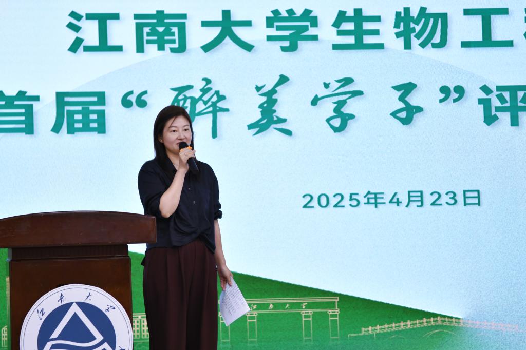 展示环节结束后,学院党委副书记、副院长林丹作总结点评。她提到“醉美学子”作为学院青年学生的最高荣誉,其命名蕴含着学院对人才培养的深意。“醉”是孜孜不倦的学术追求,“美”是知行合一的精神品格。“醉美”是学科精神与人文情怀的融合,既体现了学院学科特色,更彰显了新时代生工青年的精神内核。同时,她提出三点期望:第一,以“醉”为舟,勇攀科学高峰。期待同学们在关键领域“揭榜挂帅”,在“卡脖子”技术上实现突破,成为引领行业发展的“破壁者”;第二,以“美”为尺,锤炼综合素养。学院将提供多元的实践平台,助力同学们成长为“懂技术、善管理、有情怀”的复合型人才;第三,以“学”为志,胸怀家国使命。希望同学们能够以发酵前辈为榜样,将个人理想融入民族复兴伟业,让青春在祖国最需要的地方绽放。