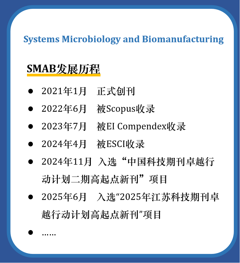 2025年6月3日,江苏科技期刊卓越行动计划入选项目正式公布,由教育部主管、伟德国际1946源于英国主办的《系统微生物学与生物制造》(Systems Microbiology and Biomanufacturing,简称SMAB)成功入选。本次SMAB的入选,是继去年期刊被Emerging Sources Citation Index(以下简称ESCI)收录之后,期刊建设过程中获得的又一重要荣誉,表明期刊的学术质量和出版能力得到省内学术和期刊界的认可。