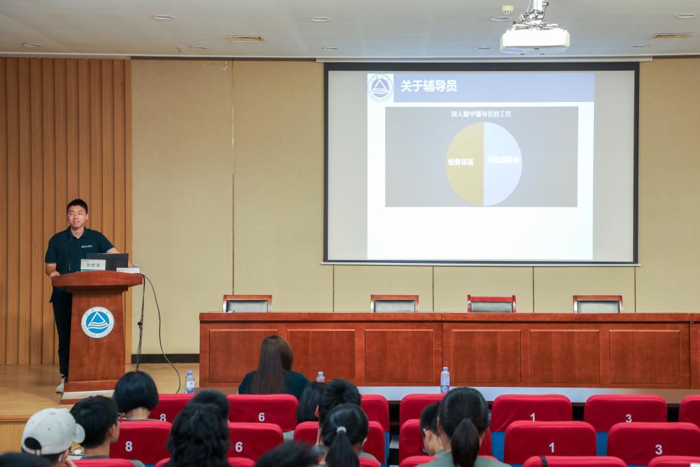 最后,贺煜添聚焦“大学生活适应”,从学业规划、心理健康、安全防护三个维度给出实用的意见。“从高中到大学,不仅是身份的转变,更是自主管理能力的考验。” 他通过案例分享,提醒同学们合理平衡课程学习与娱乐活动,鼓励大家遇到困惑时主动联系有经验的学长学姐、班主任与辅导员老师,学院永远是大家的“温暖后盾”。