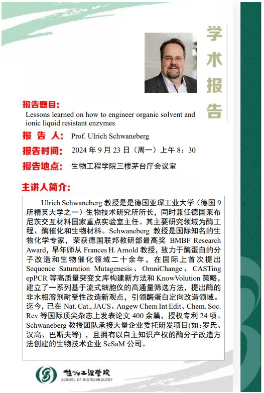 9月23日学术报告:Lessons learned on how to engineer organic solvent and ionic liquid resistant enzymes