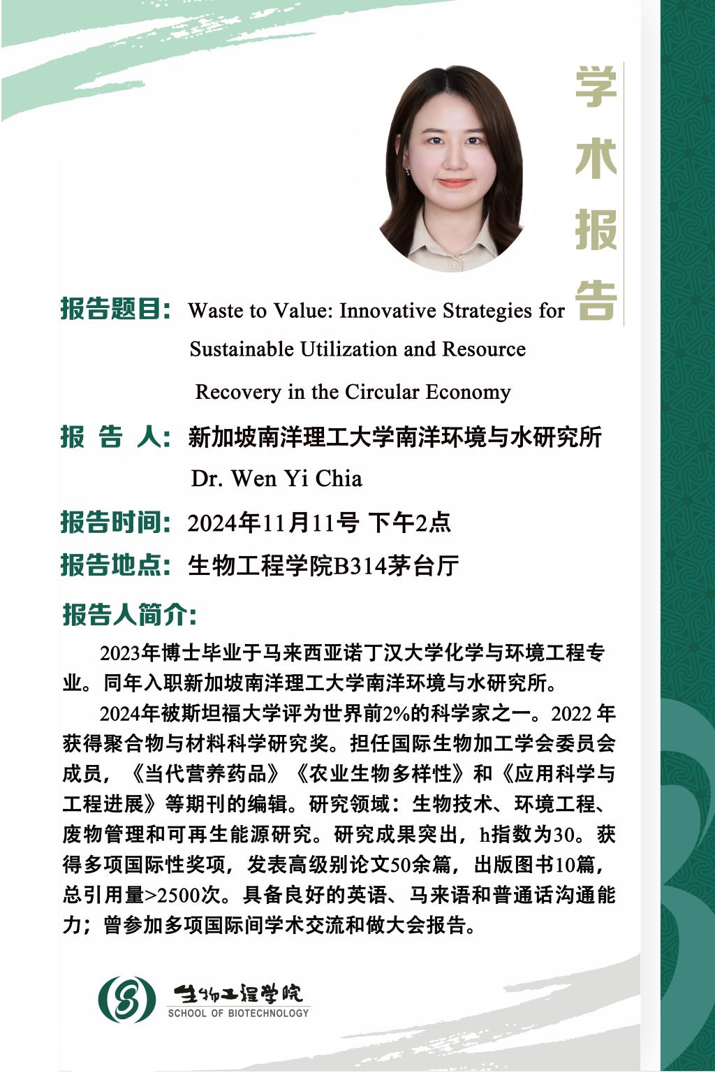 11月11日学术报告:Waste to Value: Innovative Strategies for Sustainable Utilization and Resource Recovery in the Circular Economy